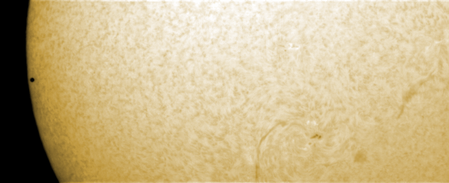 Der Merkur ist beinahe vollständig vor der Sonnenscheibe getreten (13:14), am Eintrittsort steht, schwach sichtbar, eine kleine Protuberanz: