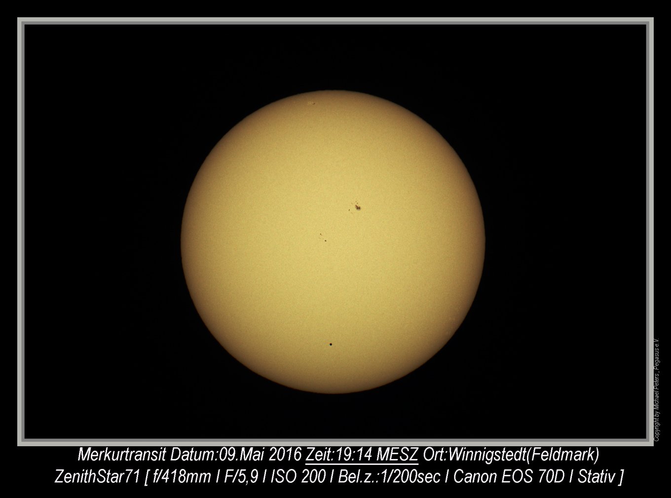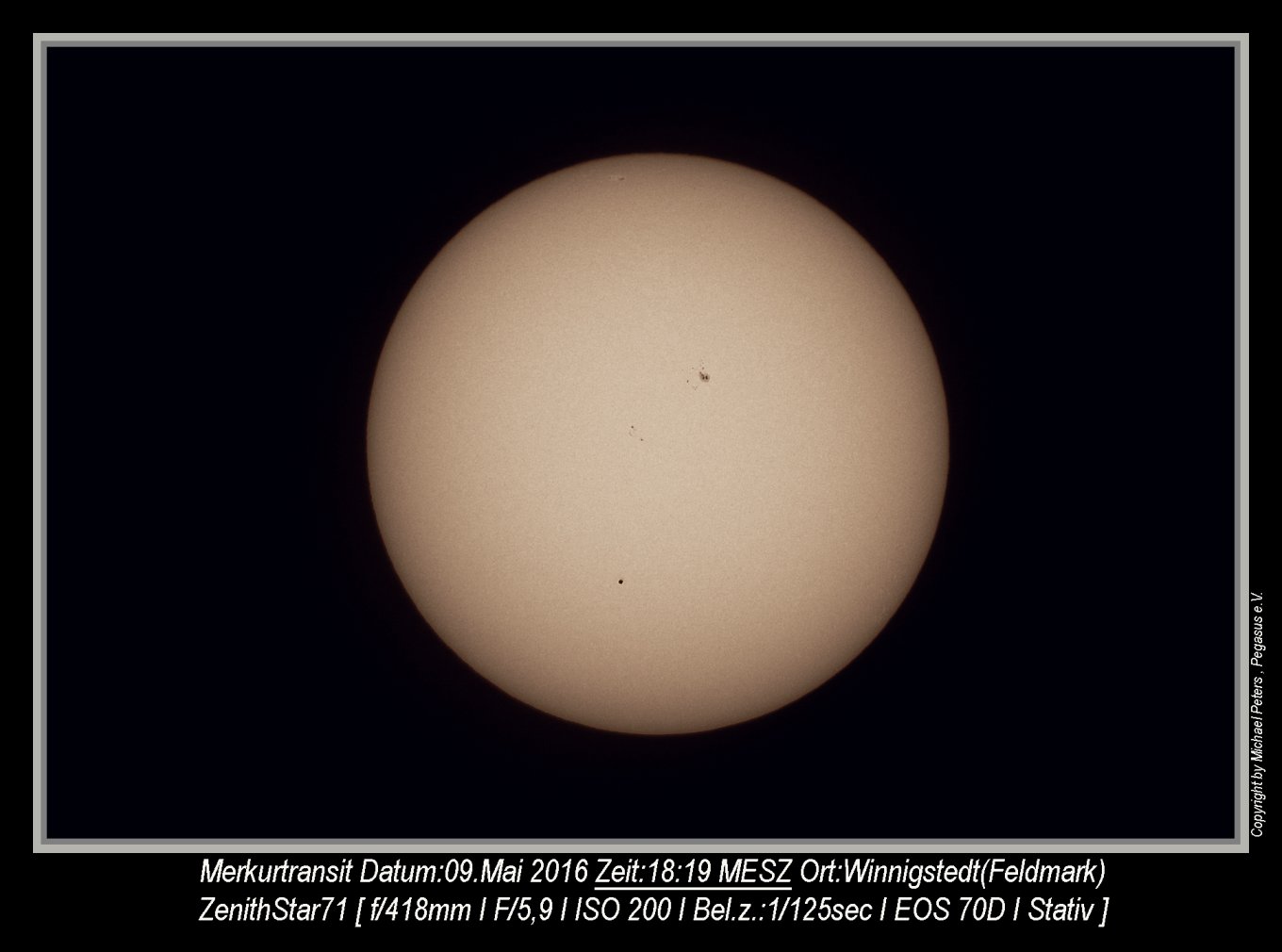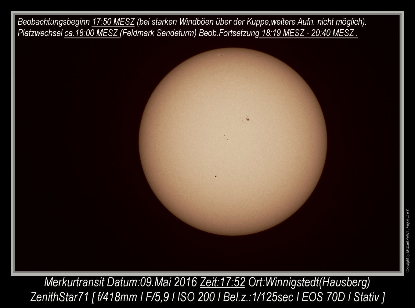 Der Merkurtransit konnte von P.Volkmer leider nur bis 15:31 Uhr fotografisch dokumentiert werden. Hier einige ausgewählte Einzelaufnahmen: