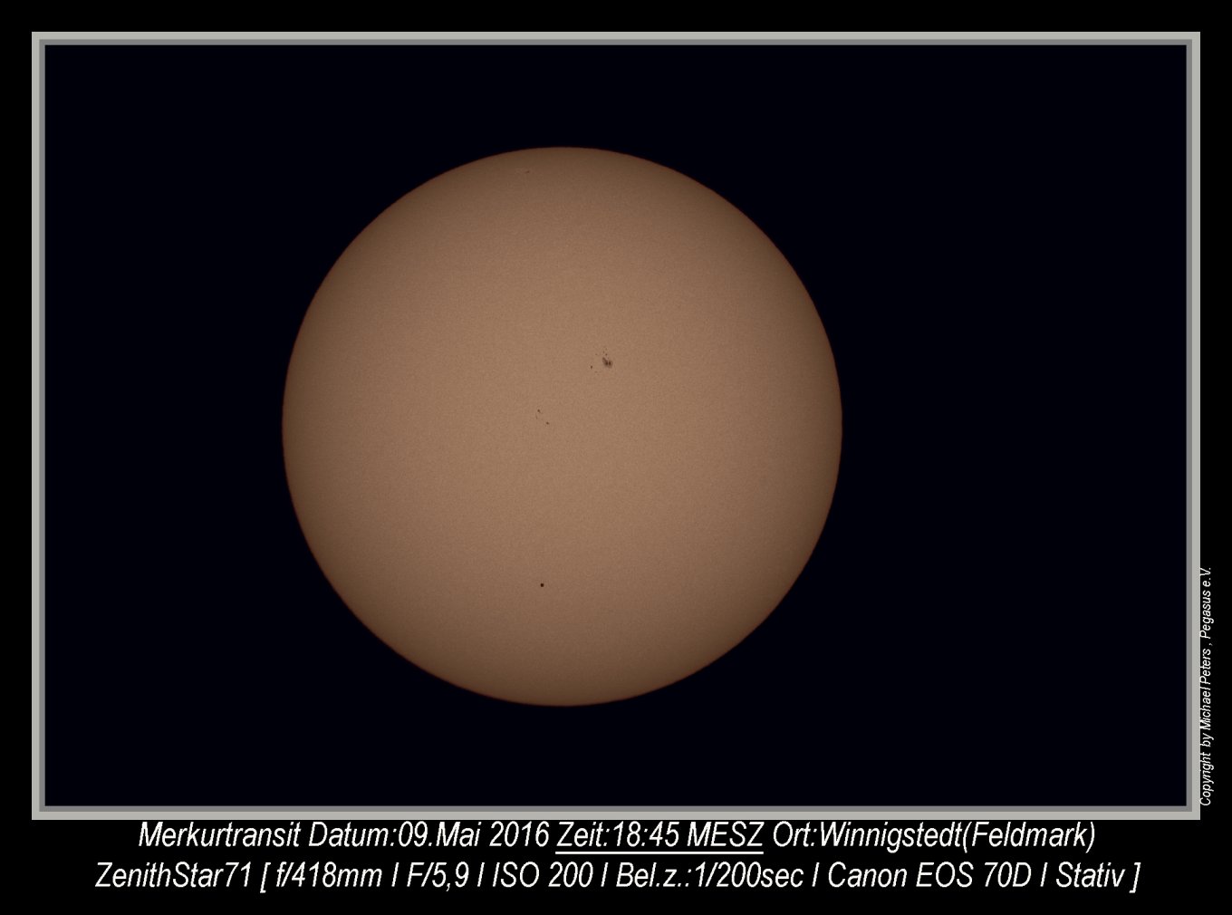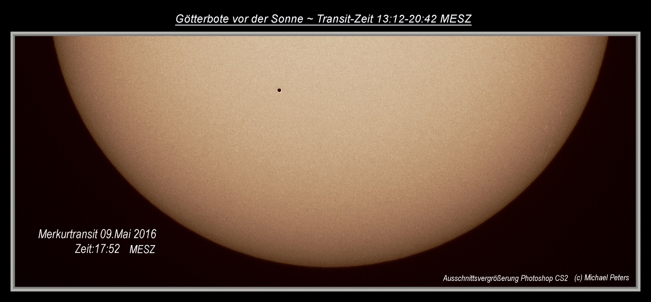 Während Peter Volkmer nur etwa bis 15:30 Uhr den Transit dokumentierte, konnte Michael Peters erst die zweite Hälfte des Transits fotografieren. Hier seine Einzelaufnahmen, die mit Peters Aufnahmen zusammen den gesamten Transit verfolgen lassen: