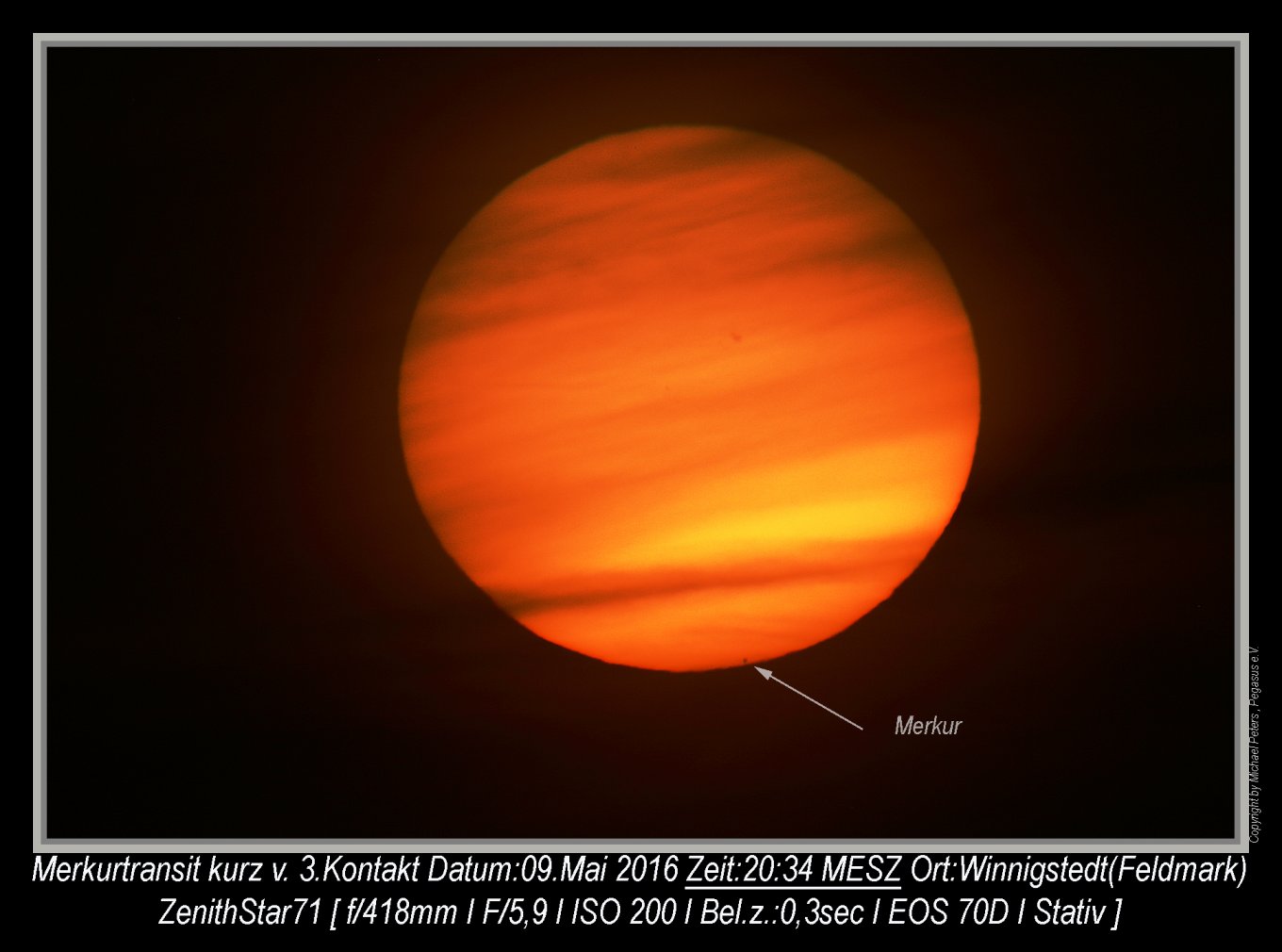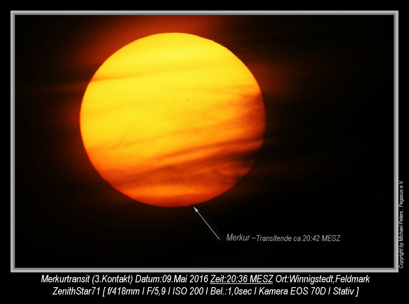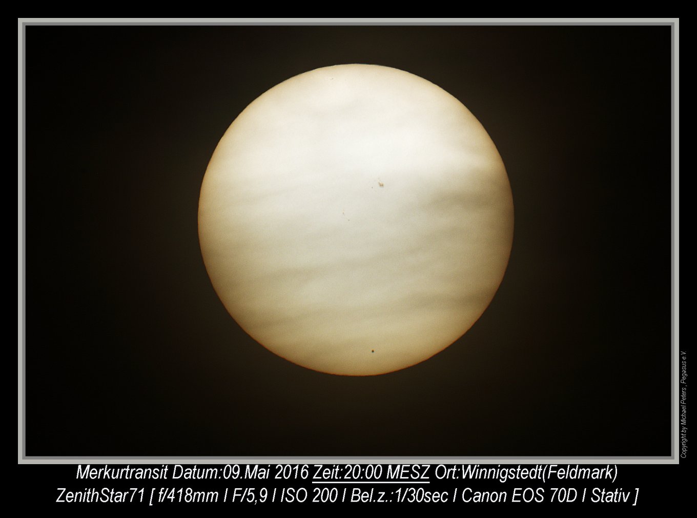 Der Durchgang konnte nur zu Anfang beobachtet werden, dann zog eine geschlossene Wolkendecke auf.